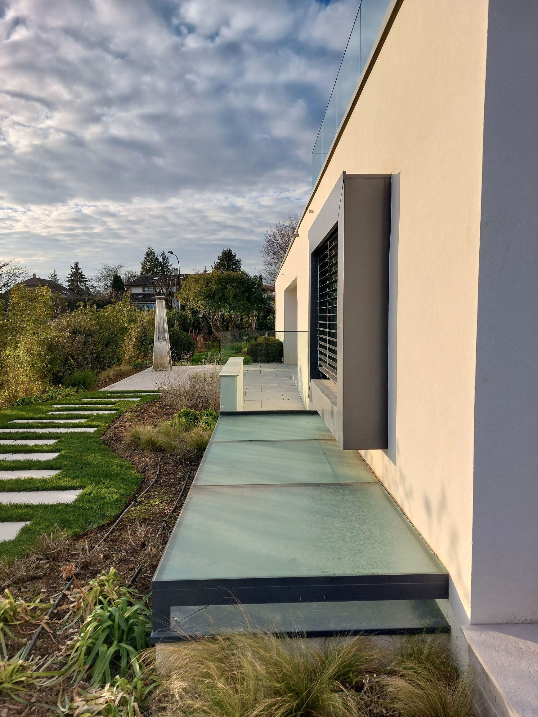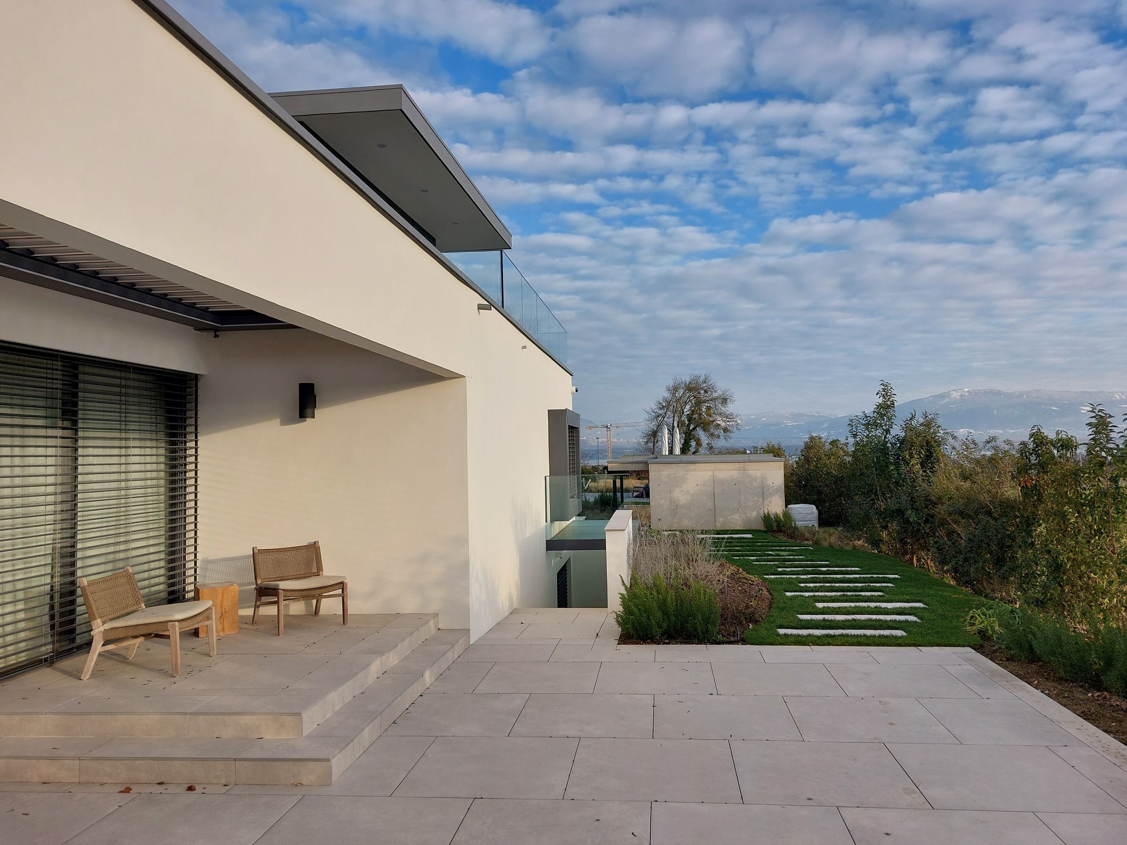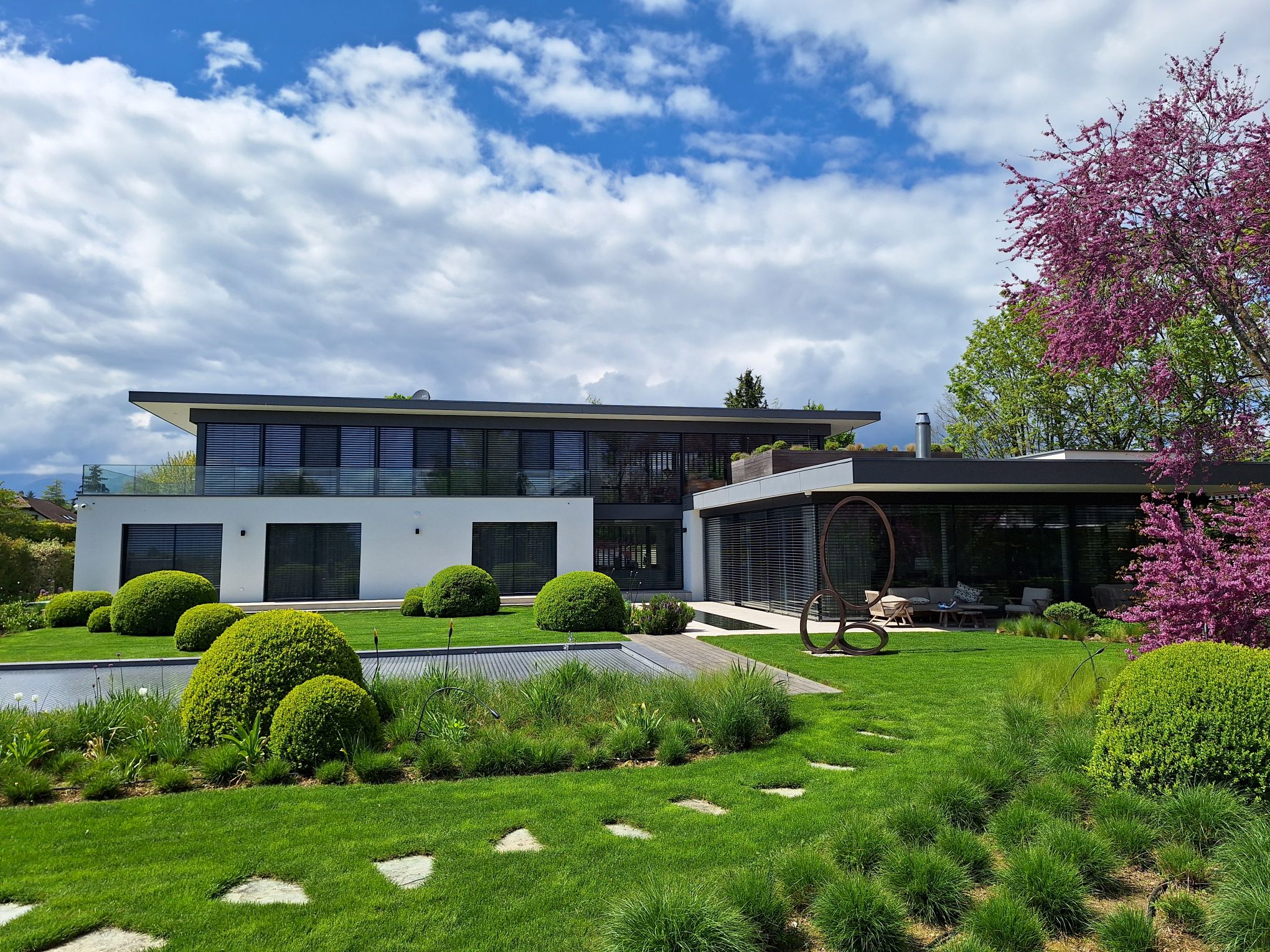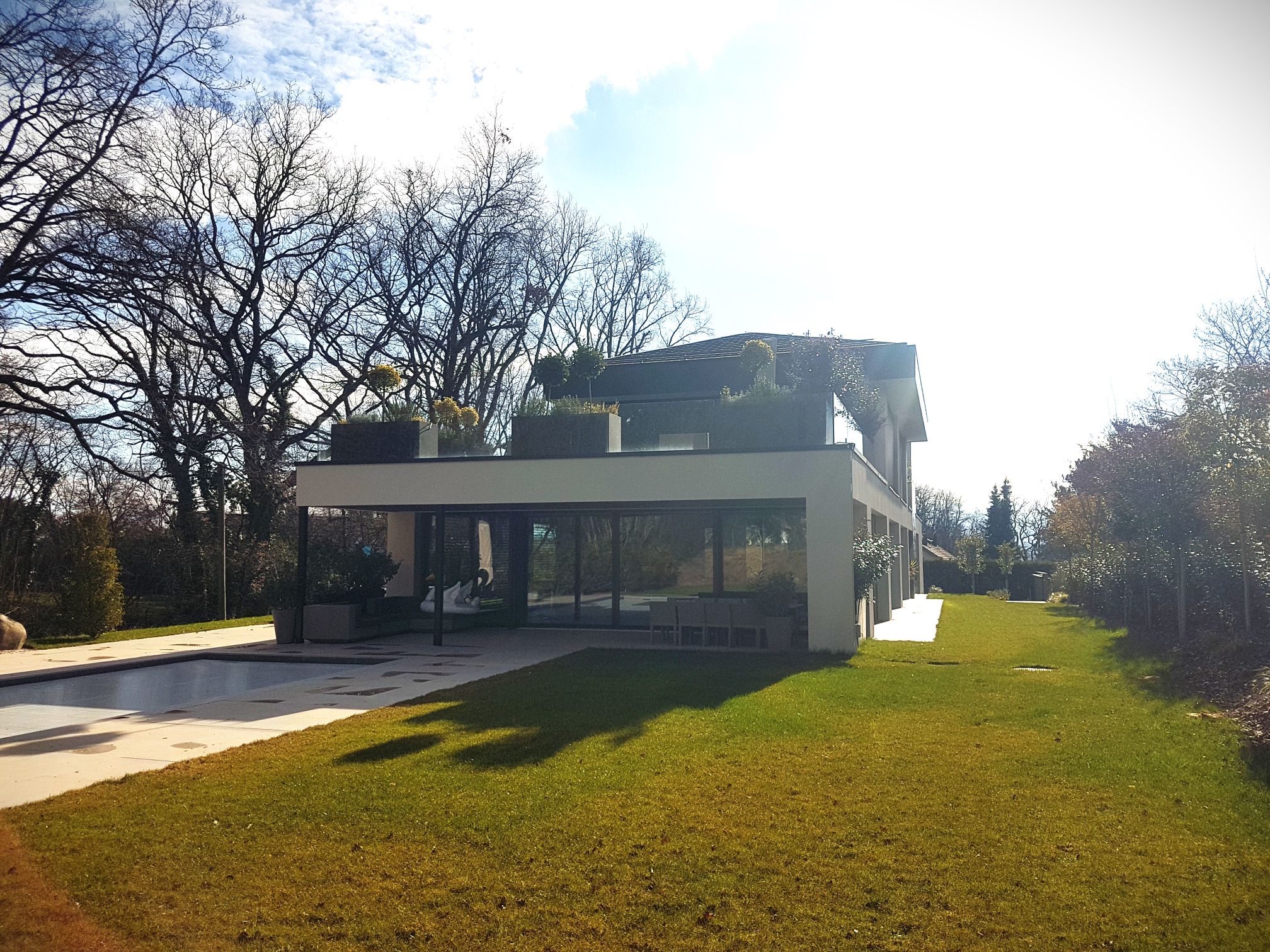Coppet 2020-2023 : Construction d’une villa avec piscine, poolhouse et aménagements extérieurs. La villa est composée comme un jeu de volumes et de « dalles flottantes » afin de créer une suite d’espaces qui lient l’extérieur avec l’intérieur et qui permettent de créer différents degrés de transparences ainsi qu’une transition fluide entre les espaces intérieurs et extérieurs.