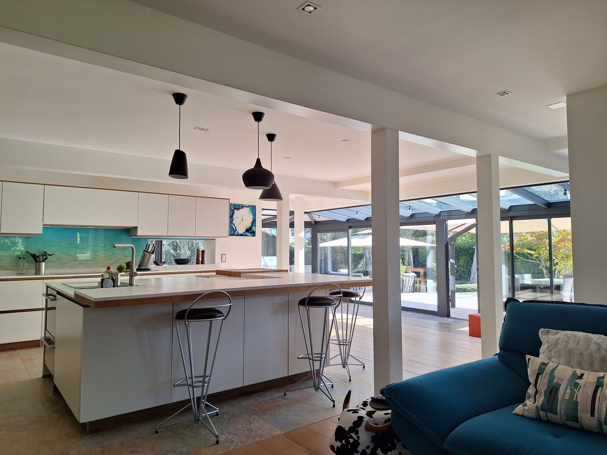 Founex 2019-2022 : Transformation et surélévation d’une villa des années 70. La surélévation en bois se distingue du rez-de-chaussée tout en créant une sensation d’unité. Fluidité des espaces intérieurs et lumière naturelle sont des thèmes directeurs du projet.