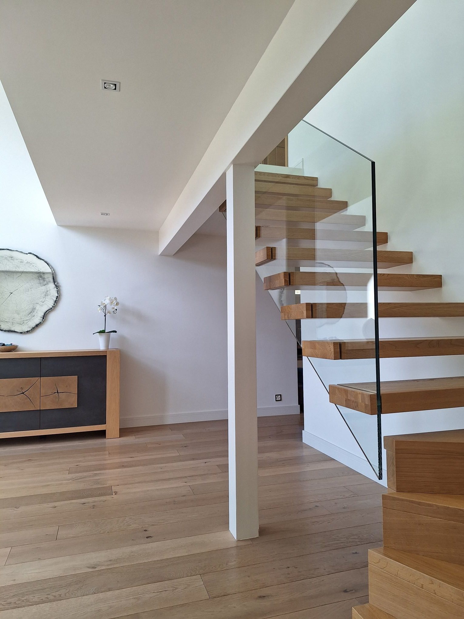 Tannay 2005 : Transformation intérieure complète d’une maison des années 60. Les murs de séparation et les plafonds à l’étage ont été démontés pour créer un espace ouvert de type loft. L’élégante structure existante en bois massif a été dégagée et mise en valeur ainsi que la cheminée.